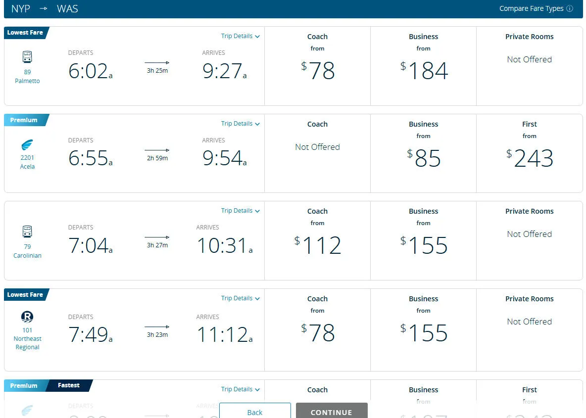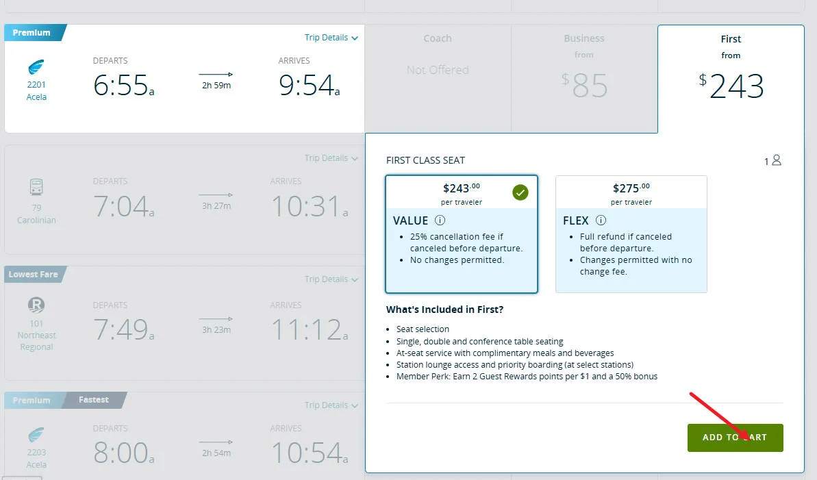 | Premium Fare | Includes Acela First Class and sleepers; offers high-end amenities, complimentary on-board food and beverages, and access to ClubAcela lounges. | Amtrak Guest Rewards members can earn a 50% point bonus for Acela First Class. |