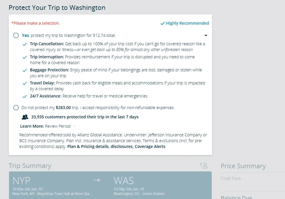 Travel Protection, Travel with Peace of Mind: Amtrak has partnered with Allianz Global Assistance to provide travel insurance and assistance services, including coverage for trip cancellation, trip interruption, baggage insurance, travel delay insurance, and 24-hour travel assistance.