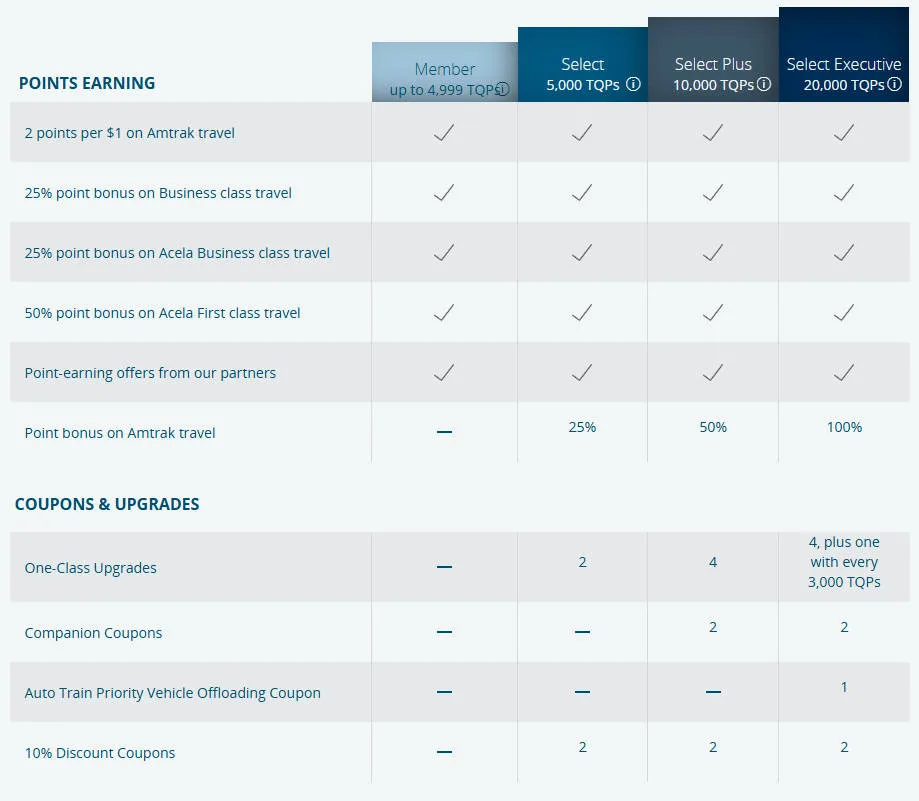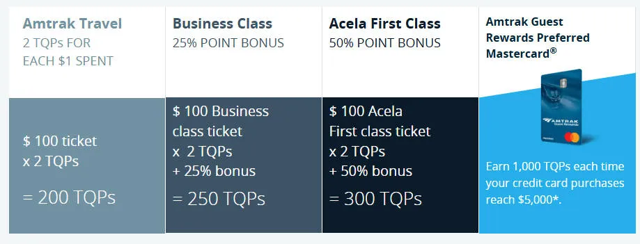 Tier Qualifying Points count towards your Amtrak Guest Rewards tier status and are earned each calendar year by traveling on Amtrak. You can receive additional TQPs by traveling in Business Class or Acela First Class, or as an Amtrak Guest Rewards Preferred Mastercard® cardholder.