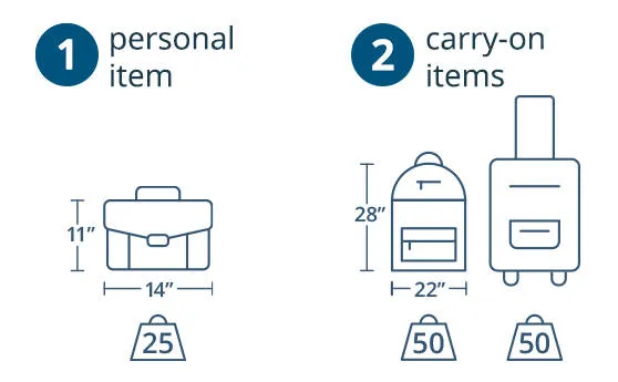 Carry-on: Each passenger can bring 2 personal items (under 25 lbs/12 kg each, max 14x11x7 inches) and 2 carry-on bags (under 50 lbs/23 kg each, max 28x22x14 inches).
