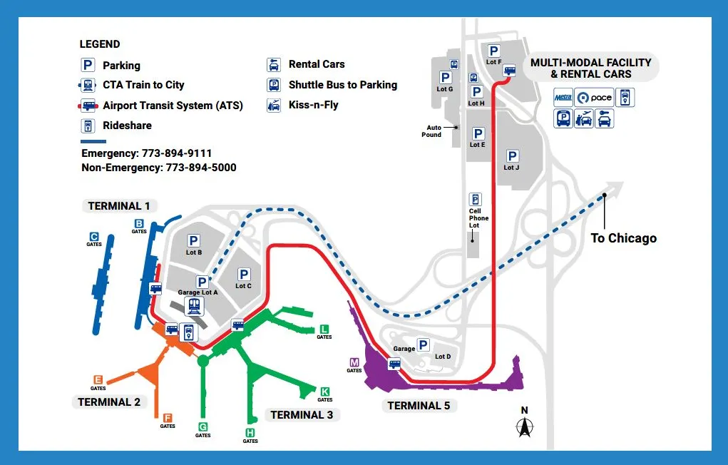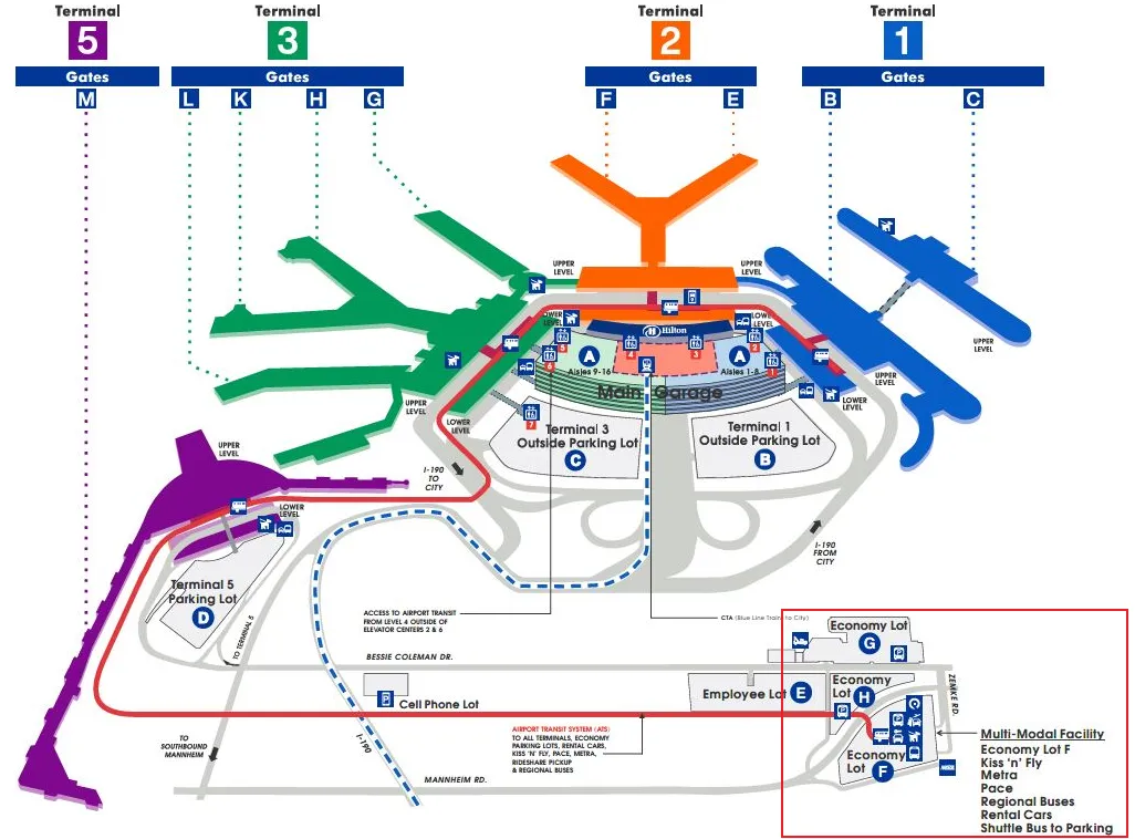 Multi-Modal Facility (MMF): Final stop for Rental Cars, Economy Parking F, and Metra trains.