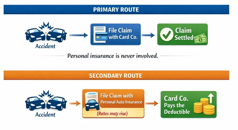 How it works: You must file a claim with your personal insurance first. The card only pays your deductible and leftover costs.
