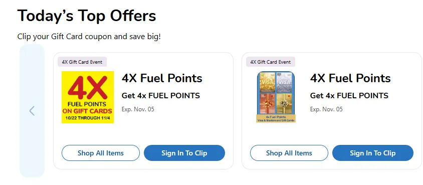 Supermarket/Mall Gift Card Rebates: Purchase Shell or ExxonMobil brand gift cards at supermarkets like Kroger or Safeway, and this purchase will trigger double supermarket fuel points (such as Kroger/Safeway fuel points).