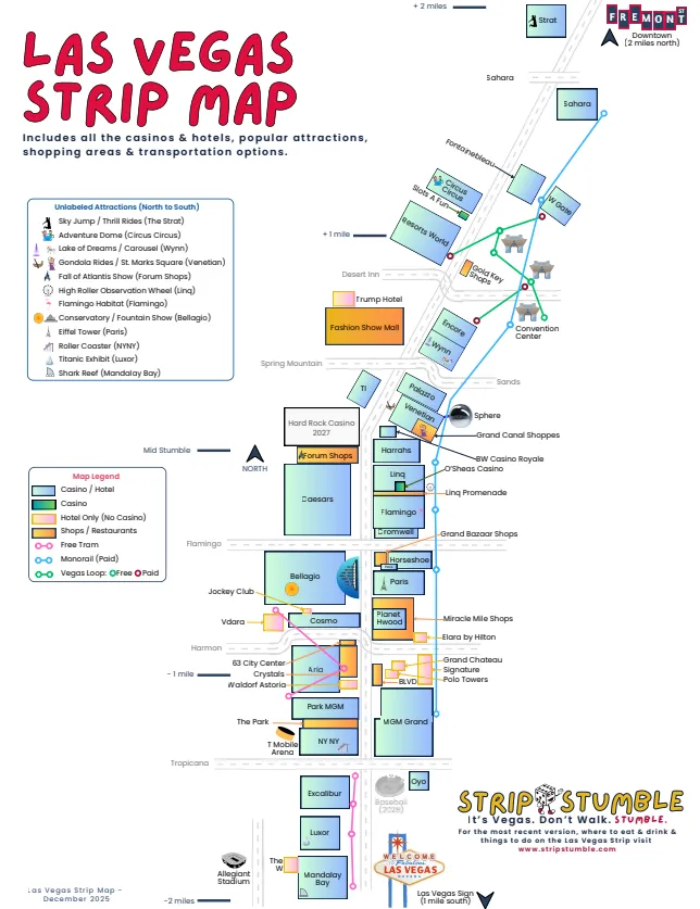 North Strip: Home to newer giants like Resorts World and the Strat. This area is currently undergoing massive development and has larger "dead zones" where walking is less pleasant.