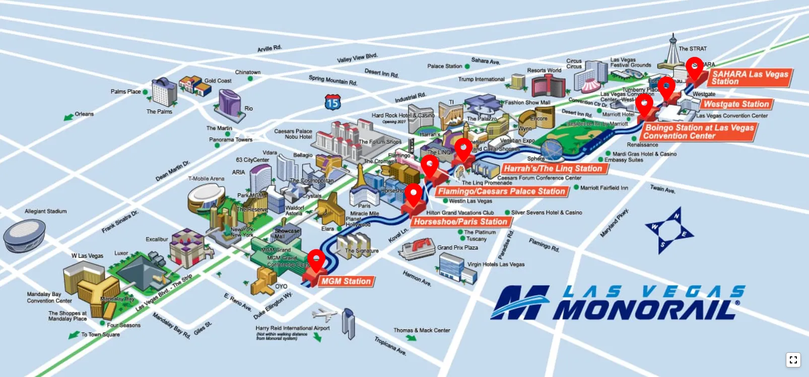 The East-West Divide: Crucially, the West Side (e.g., Aria, Bellagio) is where the free hotel trams operate, while the East Side (e.g., Harrah's, Horseshoe) is serviced by the elevated, paid Monorail.