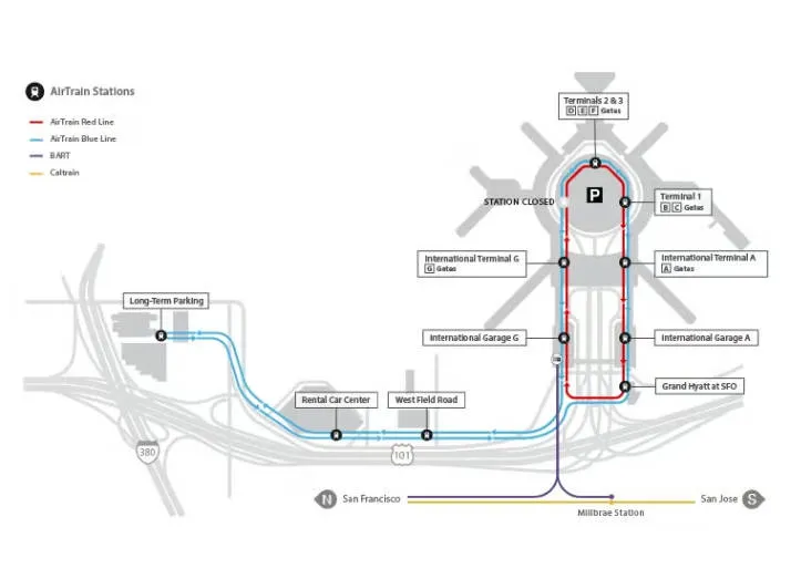 Red Line (Circular): Connects all terminals, terminal garages, the BART Station, and the Grand Hyatt at SFO. This is the fastest way to move between terminals.
