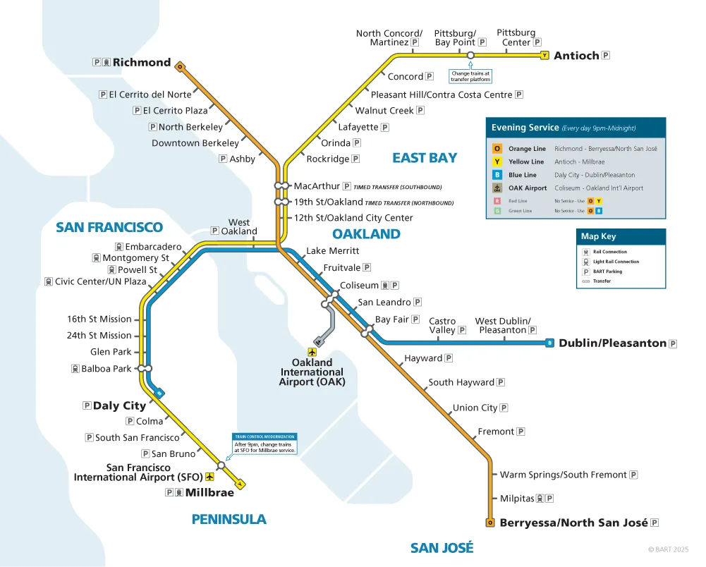 A: Uber/Lyft (24/7). BART ends around midnight.