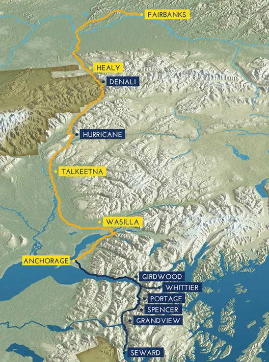 Routes connect Anchorage, Fairbanks, Denali, not dense suburbs