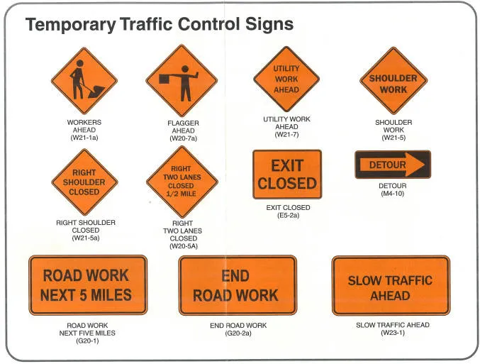 Temporary or construction signs are used in work zones to warn drivers about roadwork, lane changes, workers present, and temporary traffic patterns. Understanding these signs is critical—penalties are often higher in construction zones