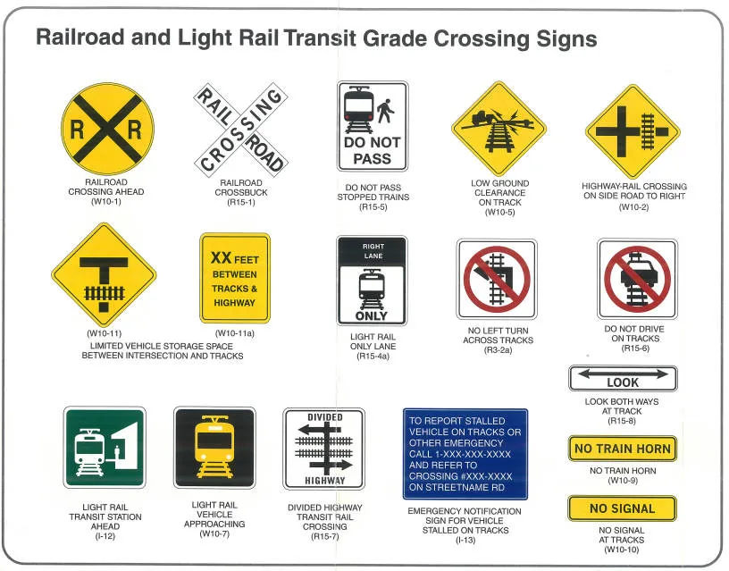 Railroad and light rail transit grade crossing signs warn drivers that train tracks intersect the road at the same level. Trains always have the right of way, and collisions are often fatal—understanding these signs is essential, especially for drivers unfamiliar with U.S. roads.