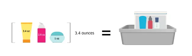 1 quart-sized bag: All 100ml containers must fit into one clear, plastic, quart-sized bag.