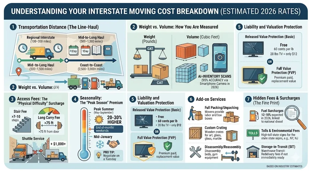 In 2026, an interstate moving quote is no longer just a flat fee. It is a complex calculation based on logistics, labor, and risk. To avoid "sticker shock," you must understand the seven core components that dictate your final bill.