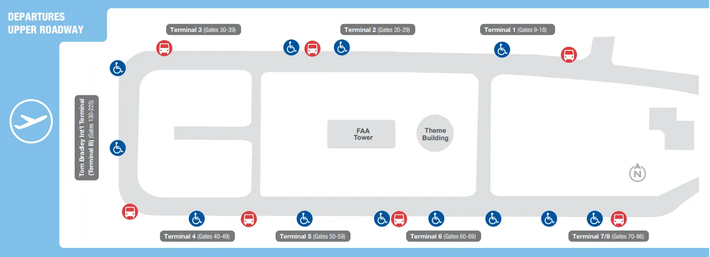 Traffic Tip: The congestion typically peaks at the "bottom" of the U (TBIT and Terminal 4) because traffic from the north side merges here. If you are flying out of Terminal 7 or 8, you are at the end of the loop, so allow extra time just to sit in traffic past the other terminals. All airport internal shuttle buses (such as the LAX-it shuttle and rental car company shuttles) travel counter-clockwise in the order of T1 → T2 → T3 → TBIT → T4... This means that if you are at T1, you will be the first to board; if you are at TBIT, the bus may already be half full.