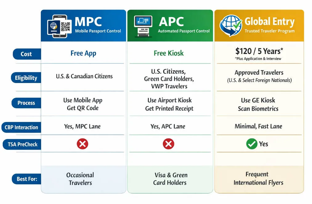 Global Entry, MPC, and APC all aim to cut US entry times, but differ in requirements, costs, perks, and experience. APC kiosks are being phased out by MPC and Global Entry.