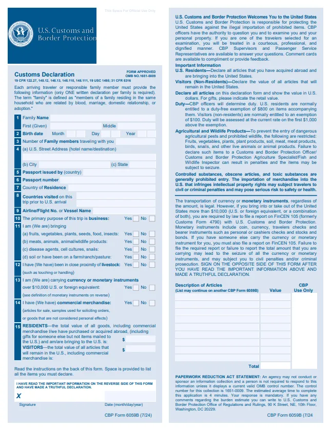 The Declaration Status: Historically, travelers filled out a blue paper form (Form 6059B). Today, most airports have replaced this with verbal declarations.