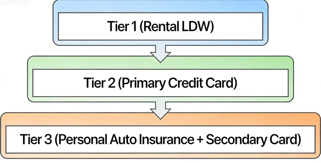Rental LDW is the lowest risk but highest cost ($30–$60/day). Credit card coverage is "free" but carries a high administrative burden and requires you to float the repair cost on your own line of credit while the claim is pending.