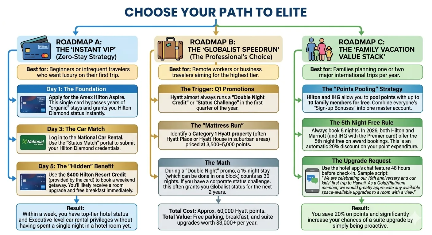 Mastering loyalty doesn't happen by accident—it happens by design. In 2026, you can choose a path based on your budget and travel frequency. Here are three "Battle-Tested" roadmaps.